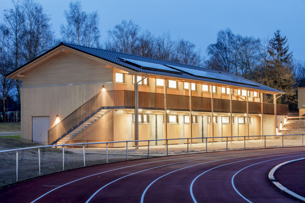 Das neue Gebäude der Sportanlage in Schneverdingen mit Umkleideräumen, Sanitäranlagen und Hauswirtschaftsräumen bietet direkten Zugang aus den Umkleiden zu den Trainigsfeldern. Das Material fügt sich gut in die umliegende Natur. Die Bauherren waren begeistert, von der termingerechten Umsetzung, der ästhetischen Wirkung und der kostengünstigen Bauweise.